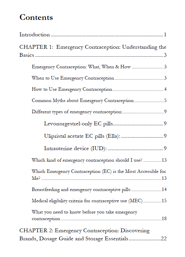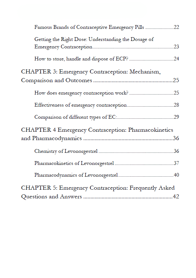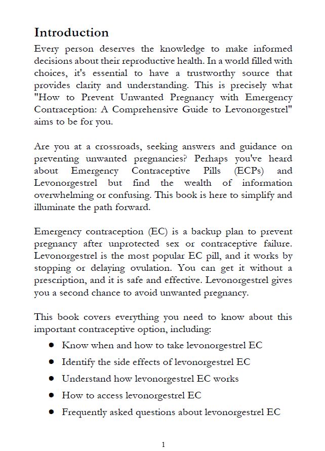 In this book, you will learn everything you need to know about EC, especially levonorgestrel, the most widely used and accessible type of EC. You will find out: